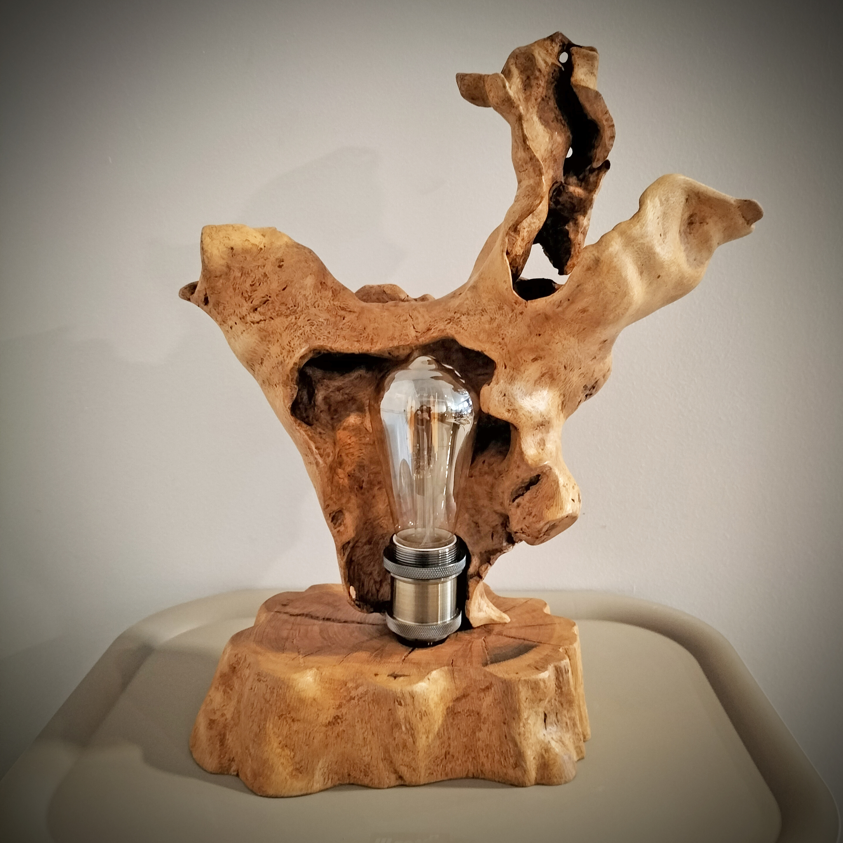 This stunning lamp is a one-of-a-kind piece, hand-carved from solid oak wood to highlight its natural contours and hollowed interior. The flowing, asymmetrical design embraces the beauty of nature’s imperfections, creating a sculptural centerpiece that feels alive with character. The organic texture and warm tones of the oak wood contrast beautifully with the industrial charm of the exposed filament bulb, which casts a gentle glow through the hollow spaces. Perfect for adding a touch of rustic sophistication to any interior, this lamp seamlessly blends artistry and functionality, celebrating the raw beauty of natural materials.
