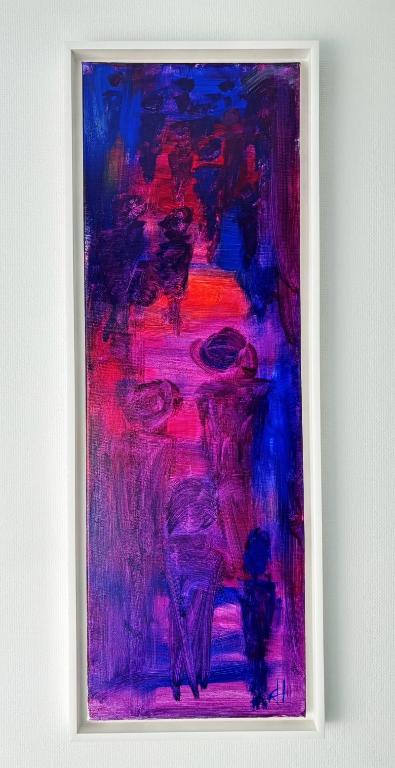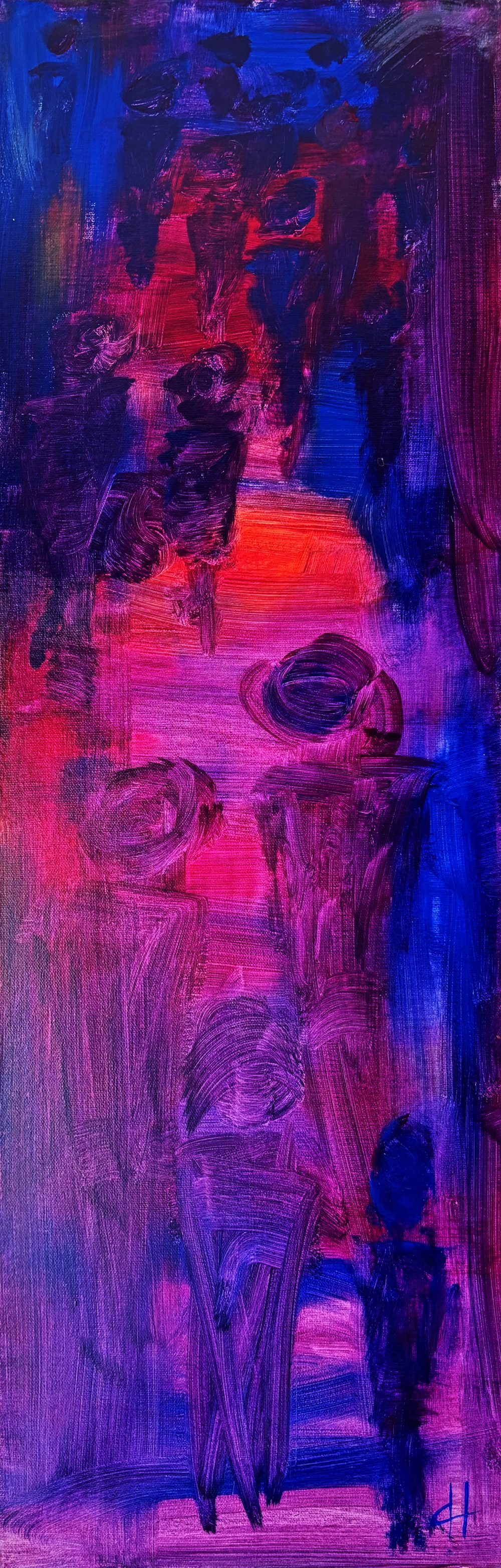 The painting is a captivating exploration of color, with bold contrasts between luminous red and magenta hues against the grounding depth of blues and purples. Sweeping, gestural strokes create dynamic movement, evoking a sense of rising energy and spiritual ascent. The composition is layered with textures that suggest forms emerging and blending, hinting at themes of connection and transformation. This artwork invites viewers to interpret the journey of ascension—whether personal, emotional, or universal—through its radiant, uplifting palette and evocative abstraction. The use of light and shadow imbues the piece with both warmth and mystery, creating a harmonious balance between groundedness and transcendence.