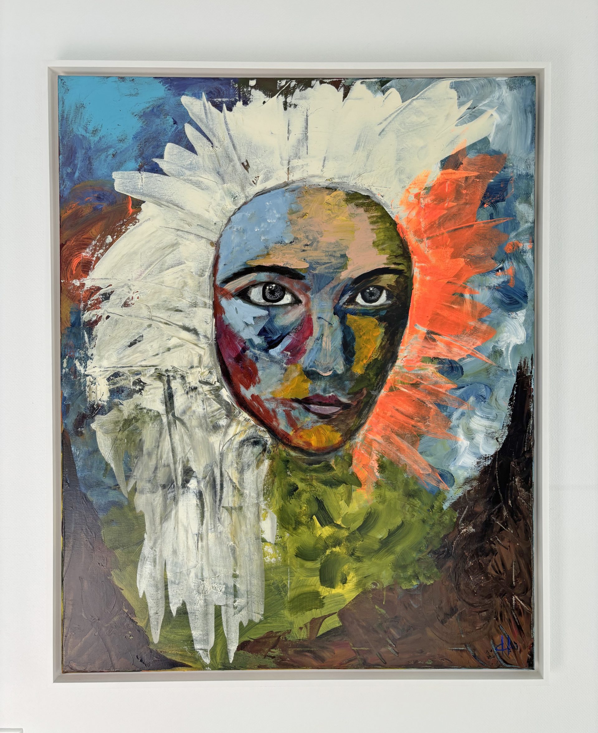 This evocative painting presents a striking fusion of the natural and human realms. A bold, expressive face emerges from a textured background, framed by a mane of white that resembles both a lion’s fierce presence and the delicate fragility of dandelion seeds in bloom. The duality of strength and vulnerability is further emphasized through the vivid color palette, with earthy greens grounding the lower composition and fiery oranges radiating at the edges, suggesting transformation and renewal. The dynamic brushstrokes and layered texture create an atmosphere of raw energy, pulling the viewer into a moment of introspection and wonder. This piece seems to ask: what lies at the intersection of human nature and the natural world?