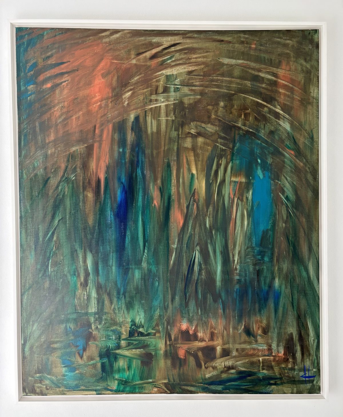 This abstract painting exudes a mysterious and atmospheric quality, blending deep greens, blues, and earthy browns with a warm glow of burnt orange. The layered brushstrokes create a sense of depth and movement, reminiscent of a forest at dusk or a reflection on still water under a fading light. The interplay of shadow and light adds intrigue, while the rich textures invite closer inspection. Evoking a mood of quiet introspection, “Dark Reflections” offers a captivating balance between serenity and enigma, making it a striking centerpiece for any contemplative space.