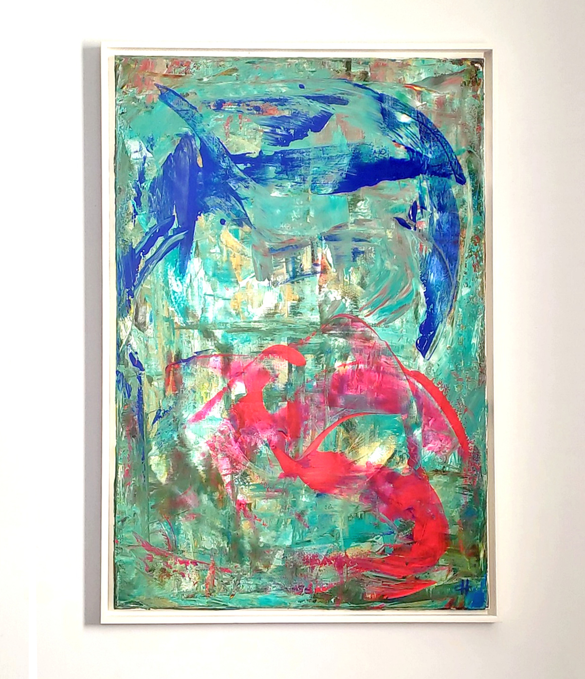 The painting showcases an energetic interplay of colors and textures, dominated by sweeping strokes of vivid blue and radiant red set against a richly layered turquoise background. The composition exudes a sense of rhythm and motion, with the bold forms intertwining and overlapping in a manner reminiscent of mythical creatures—perhaps dragons—engaged in a graceful yet powerful waltz. The background, with its soft, textured hues of green and gold, adds depth and a dreamlike quality to the piece, creating a striking contrast to the vibrant foreground elements. This artwork captures the essence of fluidity, strength, and mysticism, inviting the viewer to explore its dynamic narrative and visual complexity.