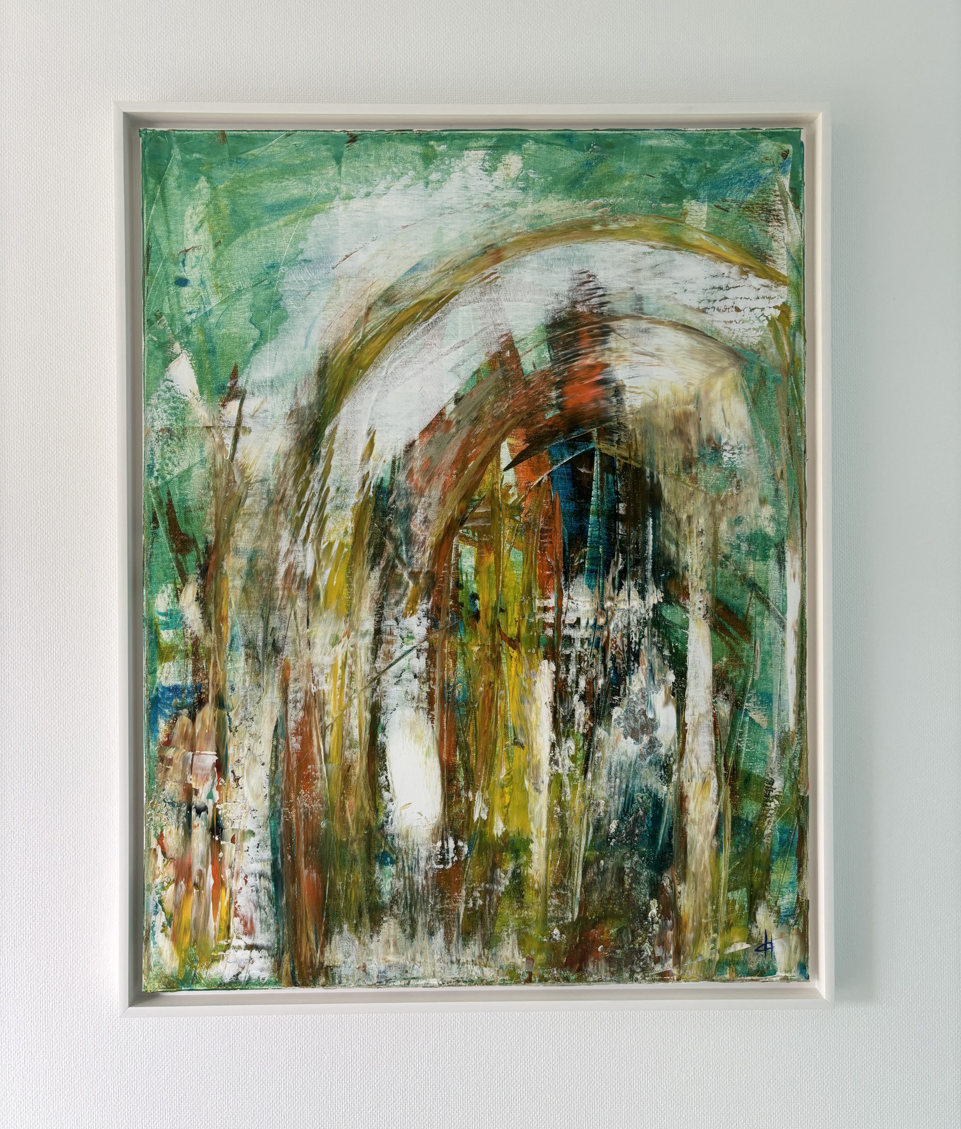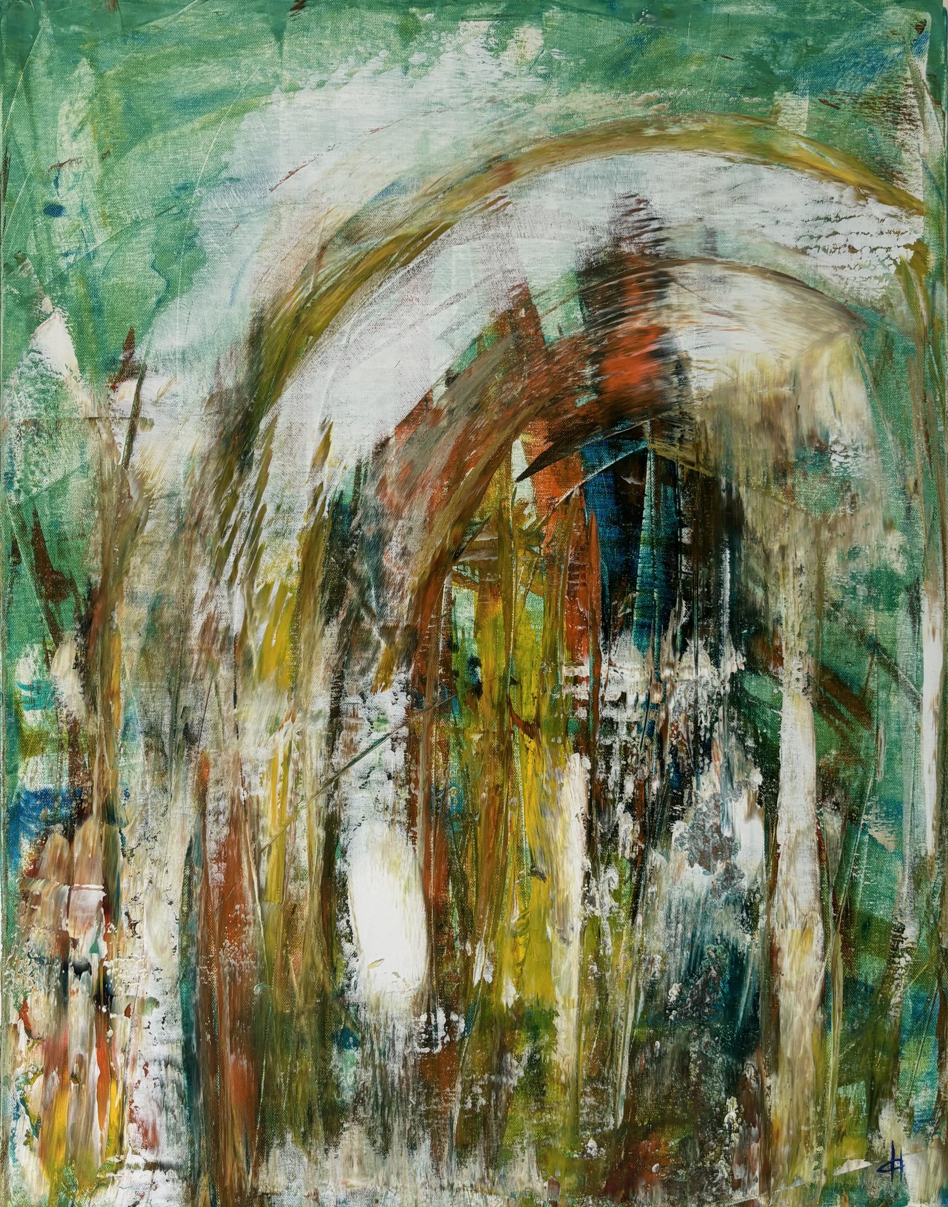 This abstract painting captures the essence of a lush, organic sanctuary with its earthy tones and layered textures. Dominated by vibrant greens, warm ochres, and hints of orange and white, the composition evokes the feeling of stepping into a mystical forest. The sweeping arcs and textured brushstrokes create depth and movement, resembling the arch of a natural tunnel bathed in light. Subtle details emerge with closer observation, inviting the viewer into a meditative exploration of the interplay between nature’s chaos and serenity. This piece brings a grounding yet uplifting presence to any space.
