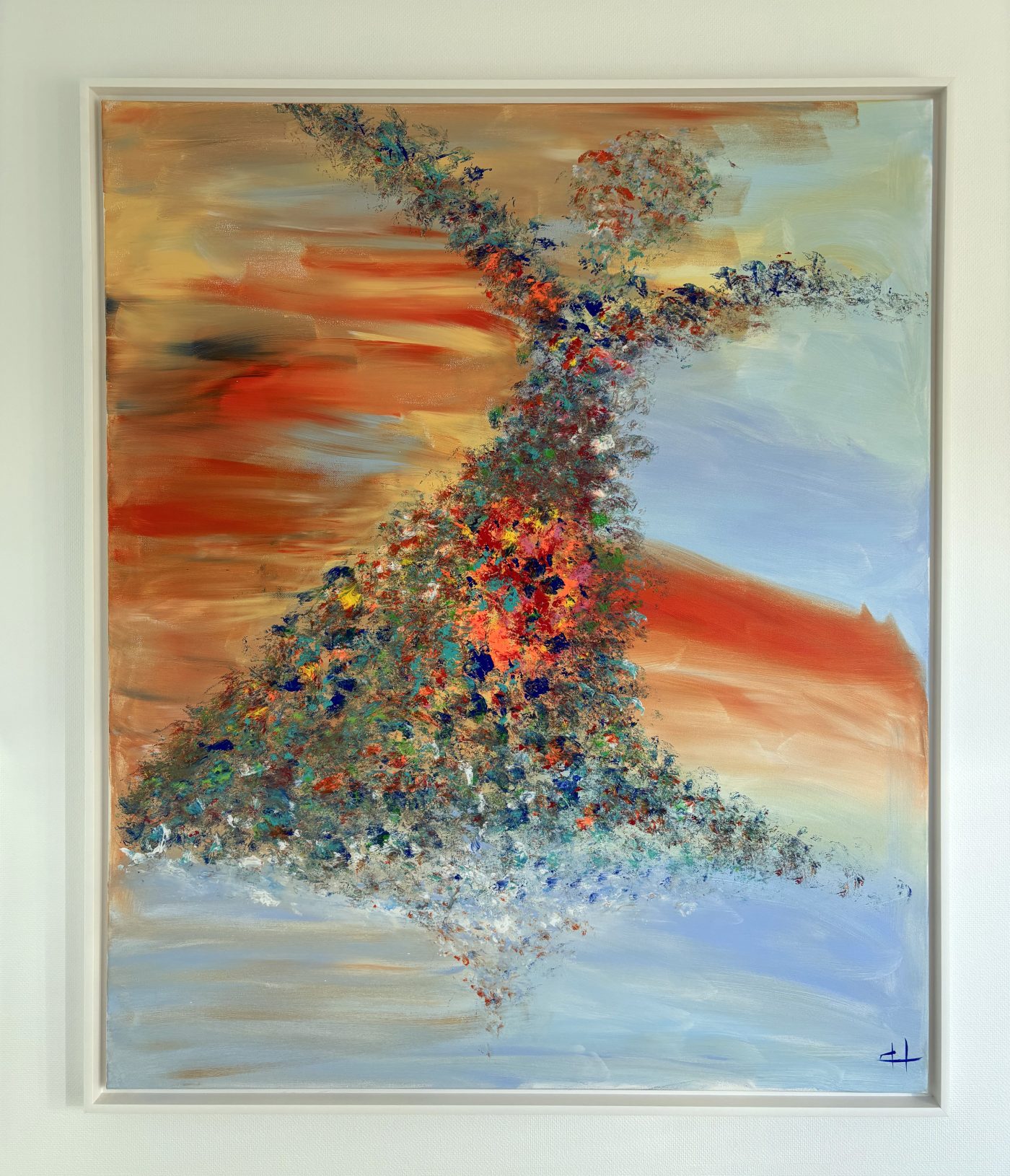 “Here We Shall Dance” is a vivid and evocative portrayal of human expression through movement. The central figure, composed of intricate dabs and splashes of multicolored paint, seems to whirl and sway against a backdrop of warm, fiery oranges and cool, calming blues. The interplay of vibrant reds, greens, and yellows within the figure contrasts beautifully with the softer, ethereal tones of the surrounding environment. The painting captures the essence of freedom, joy, and connection with the present moment. It invites viewers to embrace life’s spontaneity, urging them to join in the rhythm and flow of existence. The textured layers of paint add depth and energy, creating a mesmerizing sense of motion and celebration.