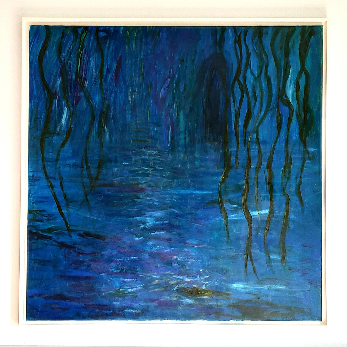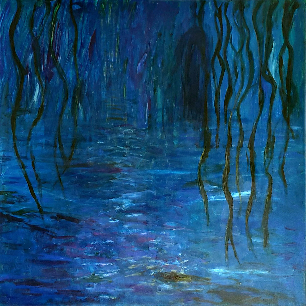 The painting immerses the viewer in a tranquil, dreamlike world dominated by shades of deep blue and accented with subtle hints of green and purple. Vertical, vine-like forms descend into a shimmering surface, which could be interpreted as water reflecting the dim light of an unseen moon. The composition creates an enigmatic sense of depth, inviting exploration into the shadowy, otherworldly space beyond. The interplay of light and dark suggests movement within the stillness, evoking a quiet yet profound connection to nature’s hidden, nocturnal beauty. This piece is an ode to solitude and the meditative qualities of mysterious aquatic environments.