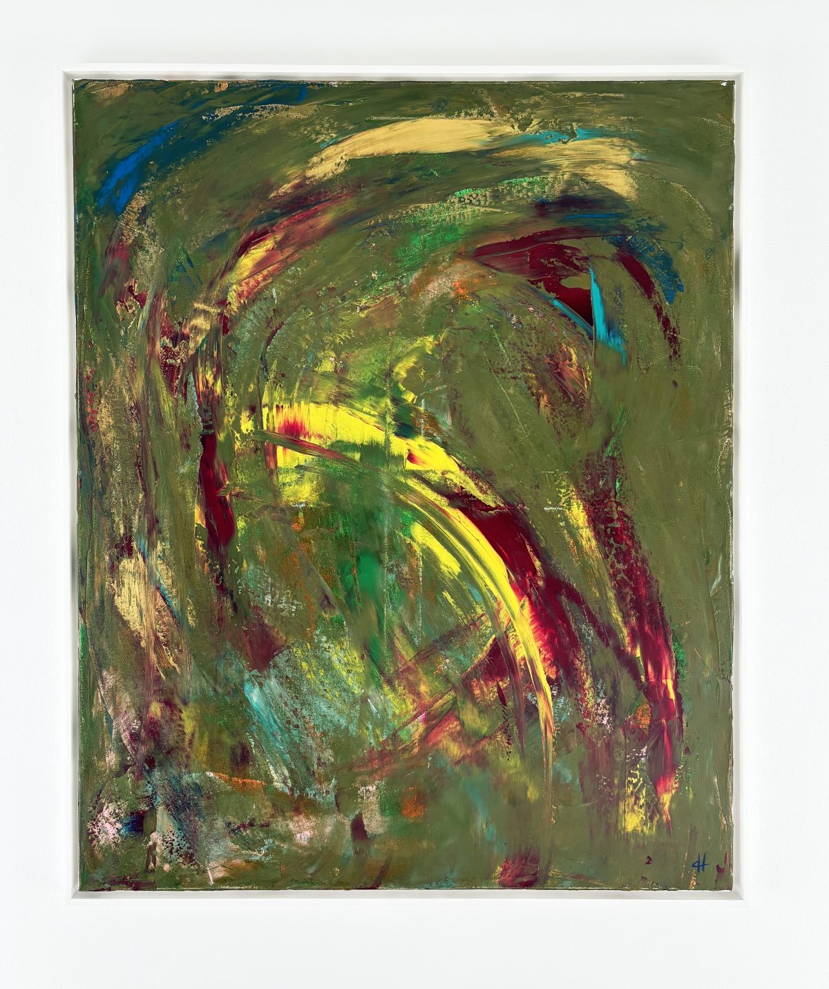 “Toucan’s Stare” is a radiant celebration of tropical vitality, rendered in bold and expressive abstraction. A verdant green dominates the canvas, interwoven with bursts of bright yellow and crimson red, symbolizing the vivid feathers and dynamic spirit of the toucan. The composition swirls with motion, guided by sweeping arcs and textured layers, suggesting the energetic environment of a lush rainforest. Flashes of turquoise and ochre further enhance the vibrant palette, creating depth and intrigue within the abstract forms. This painting invites viewers to feel the vitality and movement of the tropics, embodying the exotic allure and charisma of its namesake. It’s a piece alive with rhythm and color, both grounding and energizing the viewer in its lush embrace.