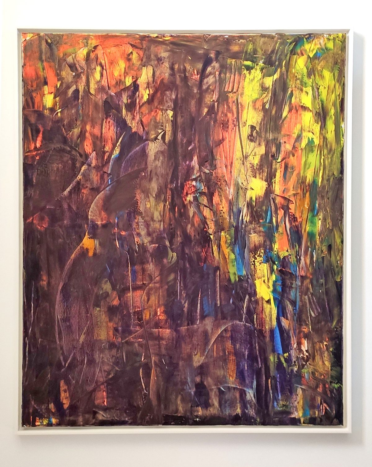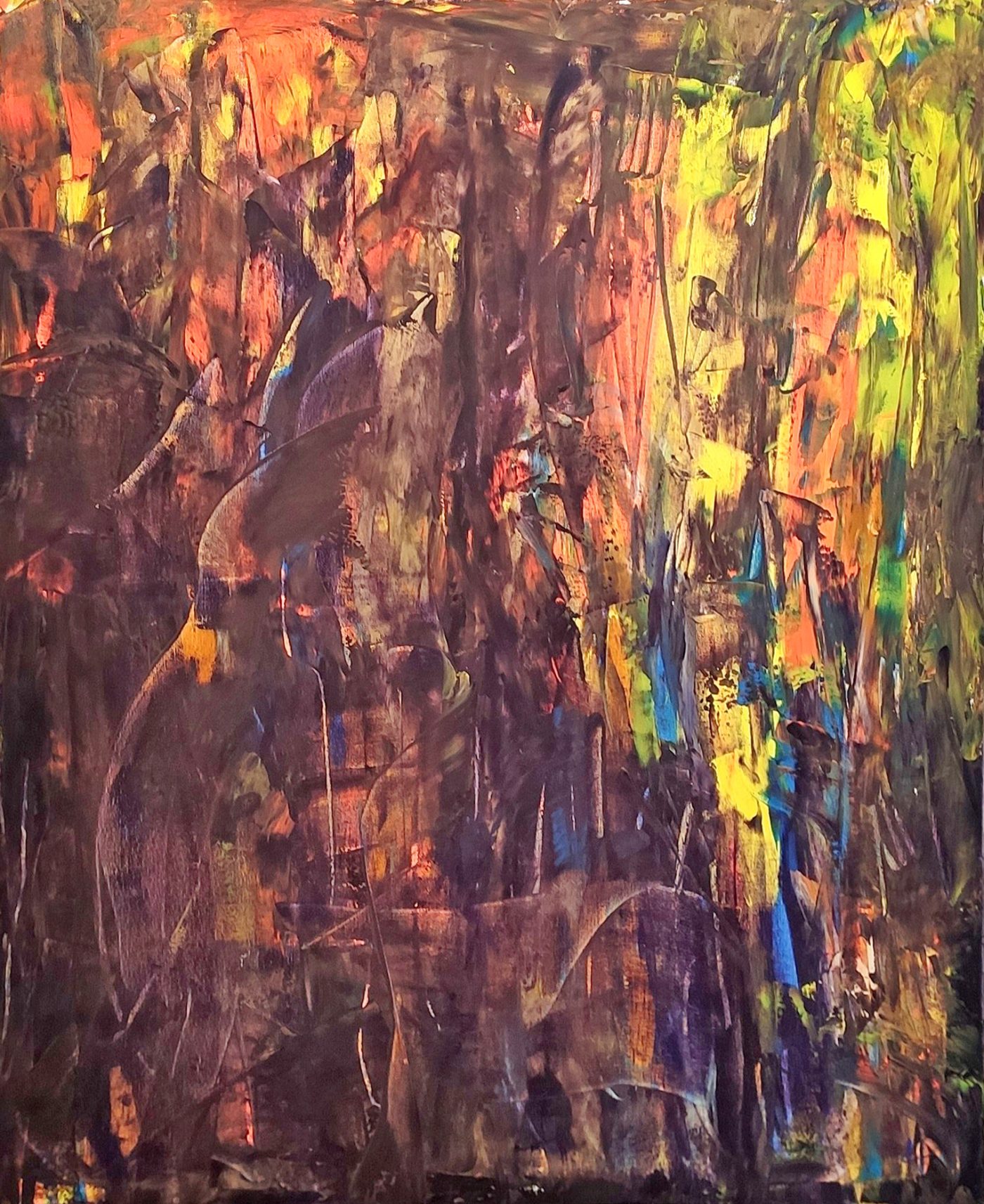 The artwork portrays a dynamic interplay between darkness and light, with earthy browns and purples forming a backdrop for glowing hues of orange, yellow, and blue. The composition is richly textured, with layered brushstrokes creating a chaotic yet harmonious energy. The luminous areas seem to radiate from within, capturing the essence of embers rising and dancing in the dark. The painting conveys a sense of transition—destruction giving way to renewal—as the flames hint at both warmth and volatility. The abstract nature invites personal interpretation, but the imagery resonates with themes of resilience, transformation, and the cyclical nature of life. It is a celebration of the enduring beauty found in fleeting, fiery moments.